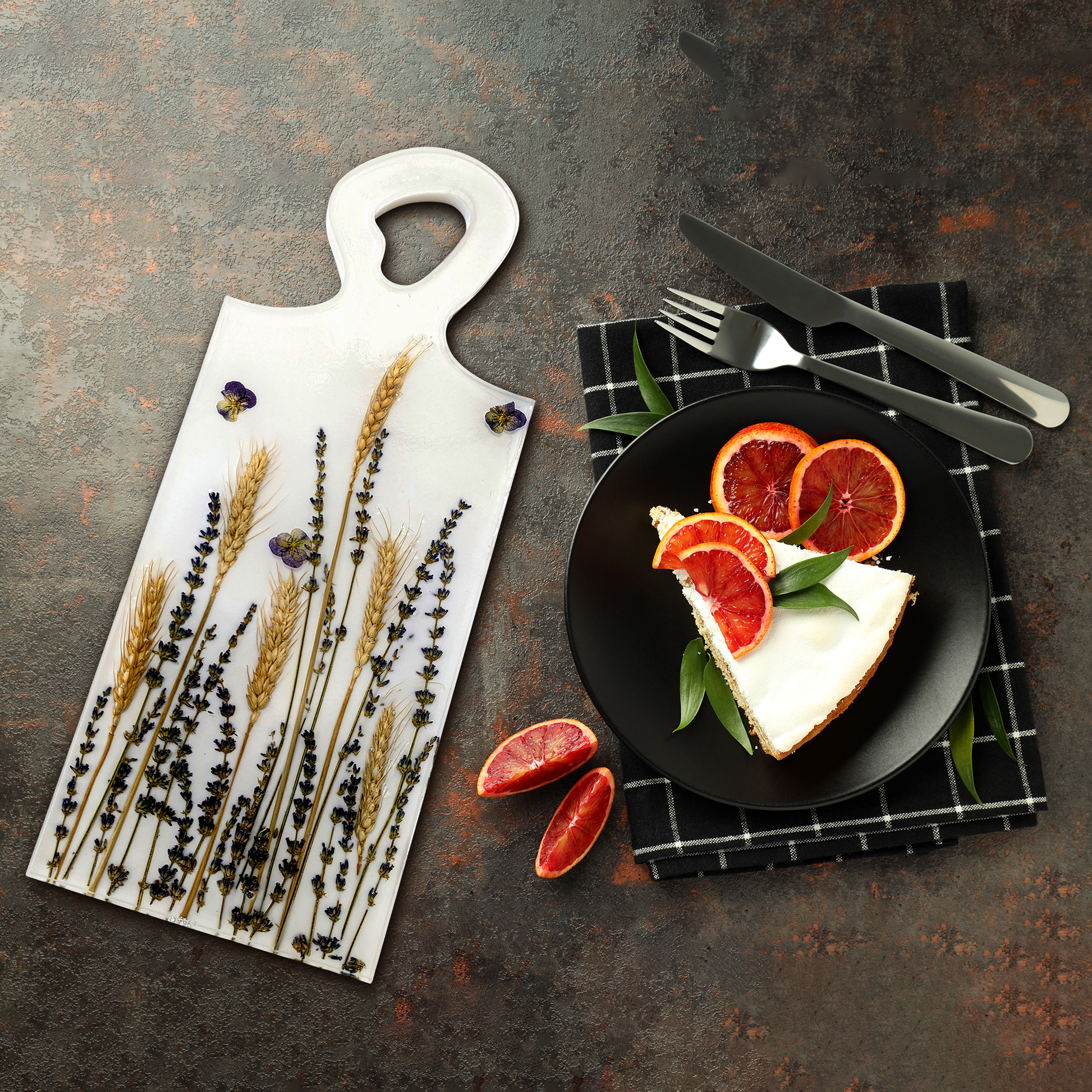 The natural beauty of the wheat and lavender is truly mesmerizing. The delicate arrangement of the wheat strands and lavender blooms creates a sense of warmth and abundance, while the transparent glass-like layer allows you to fully appreciate the texture and color of the ingredients.