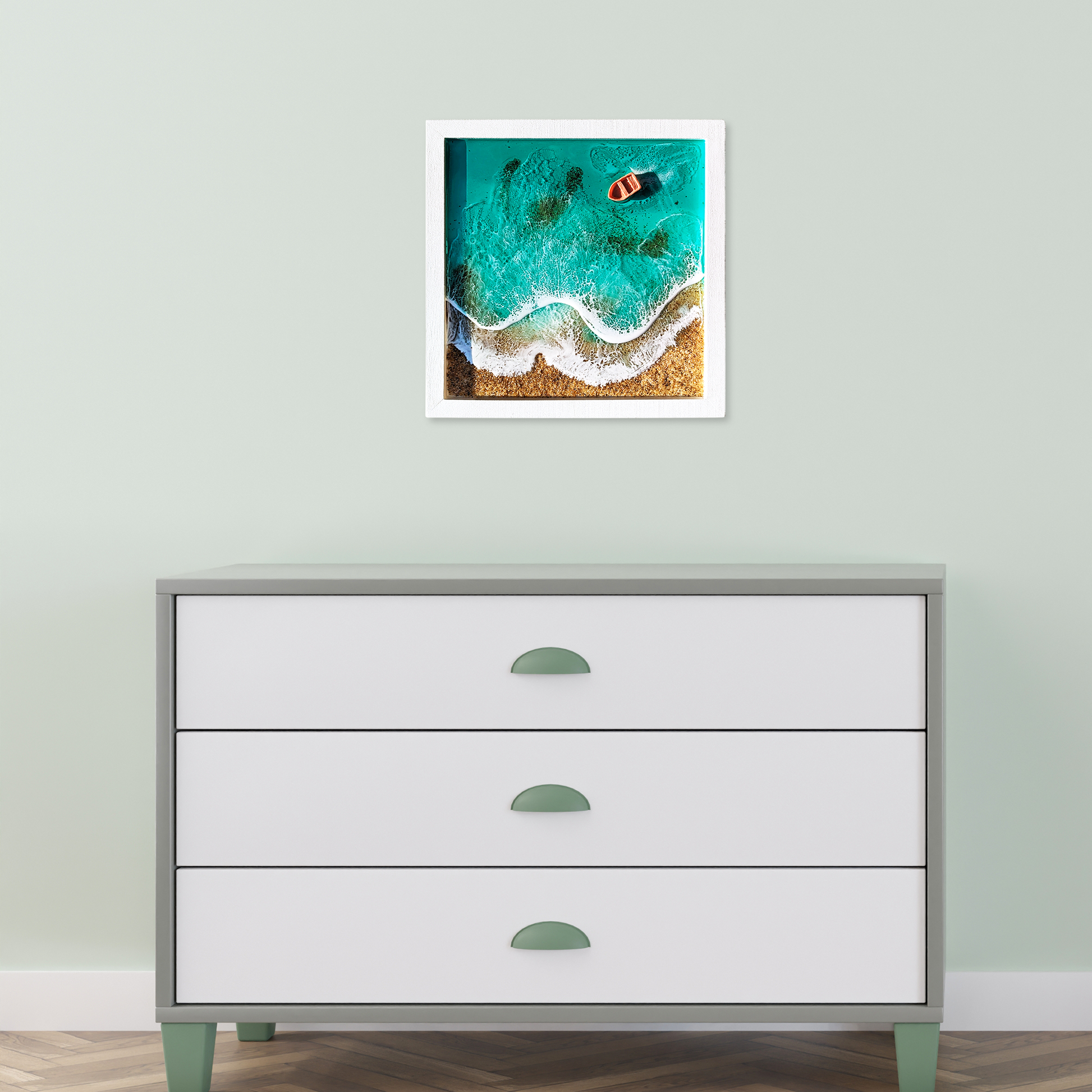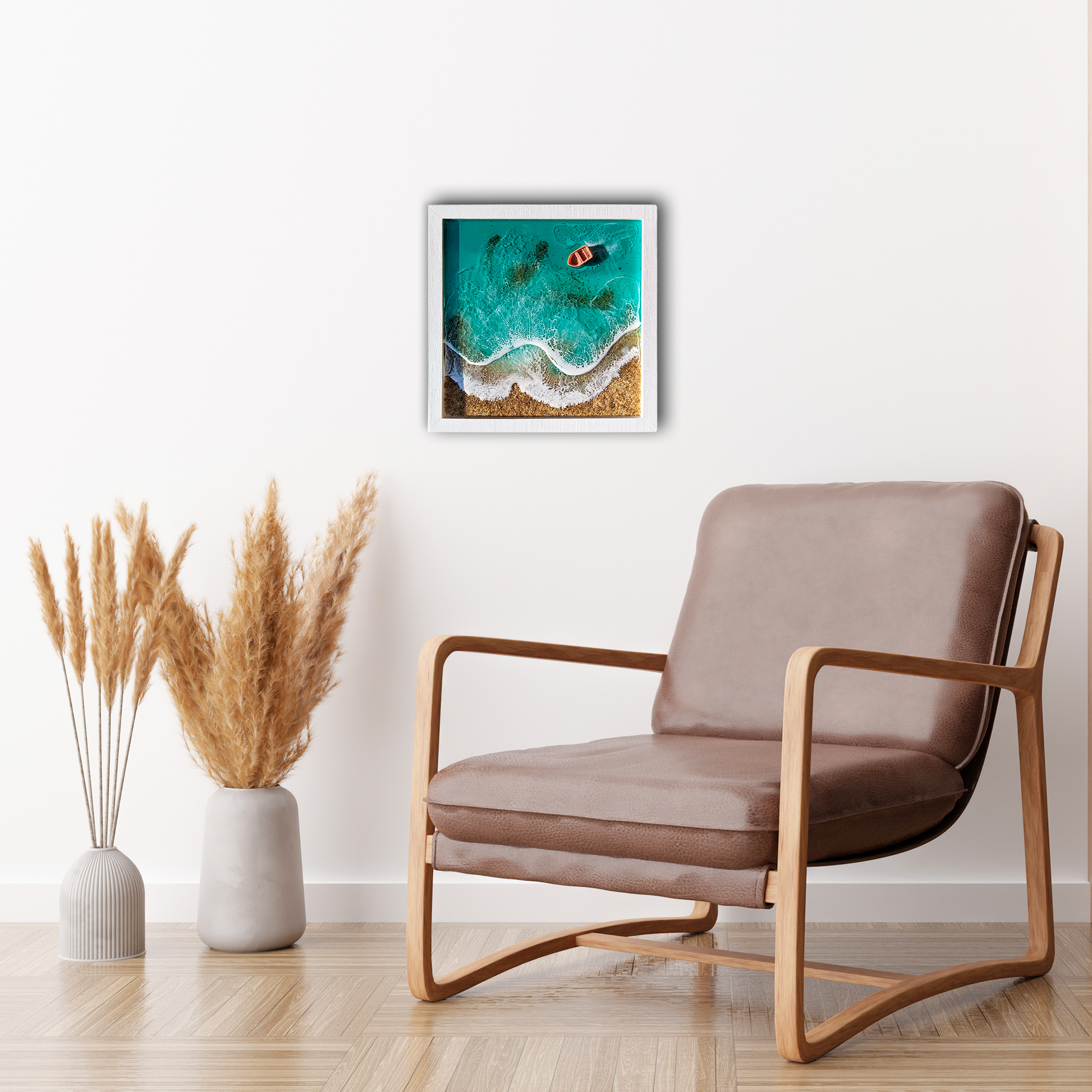 As you gaze upon my resin ocean painting, you will be transported to a serene beach with rolling waves crashing onto the sandy shore. The real sand used in the painting adds texture and depth, inviting you to run your fingers over its surface.