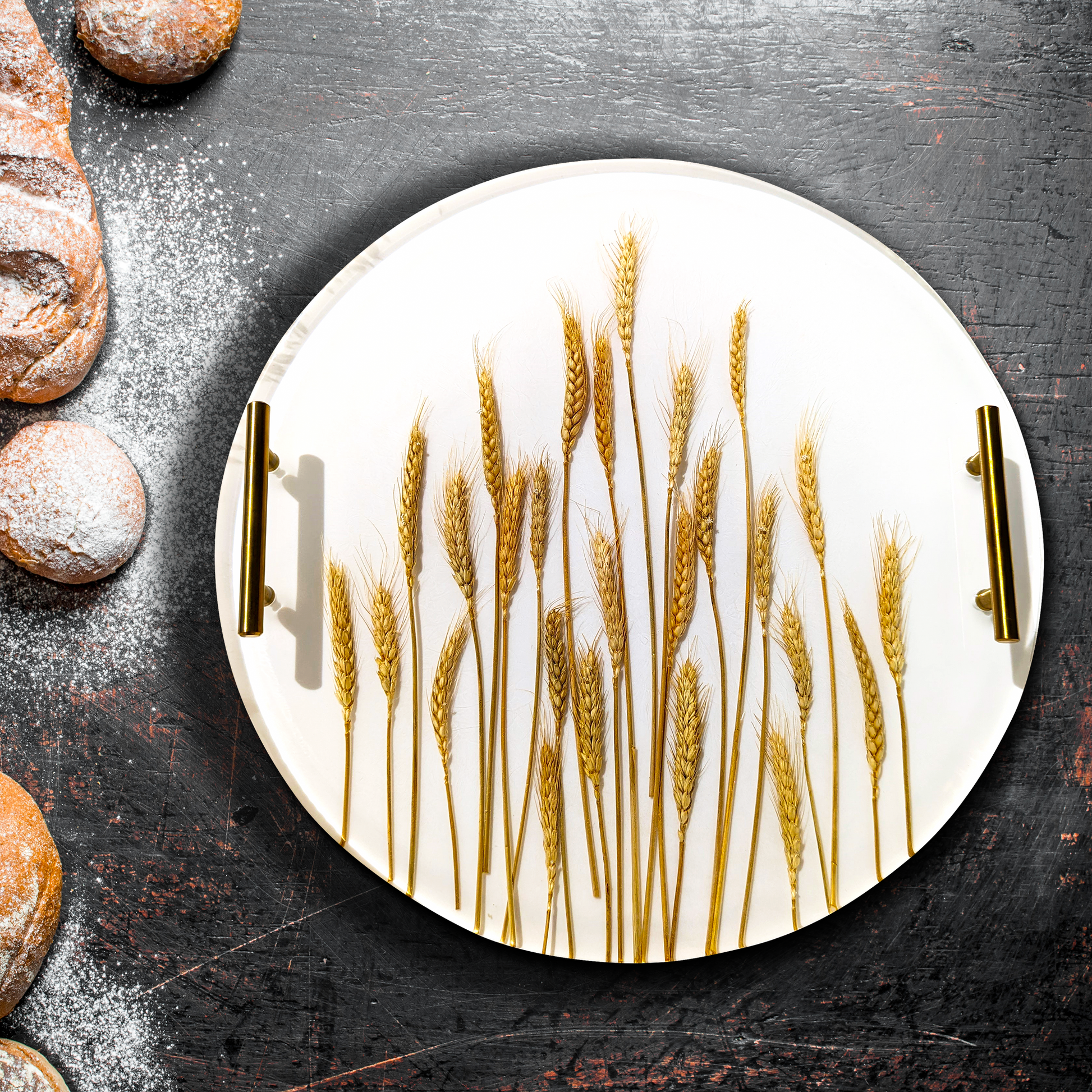 As you gaze into the tray, you'll be drawn in by the delicate and intricate arrangement of the wheat strands. The transparent glass-like layer allows you to fully appreciate their texture and color, creating a sense of wonder and admiration.