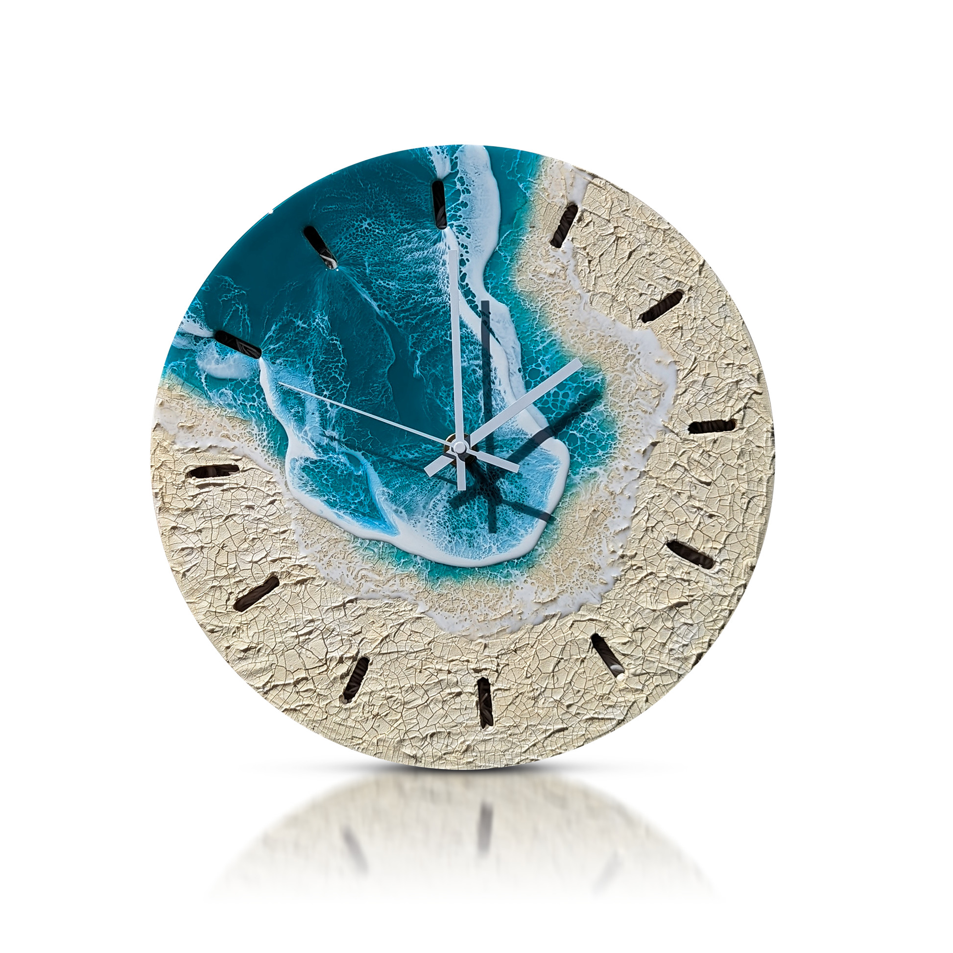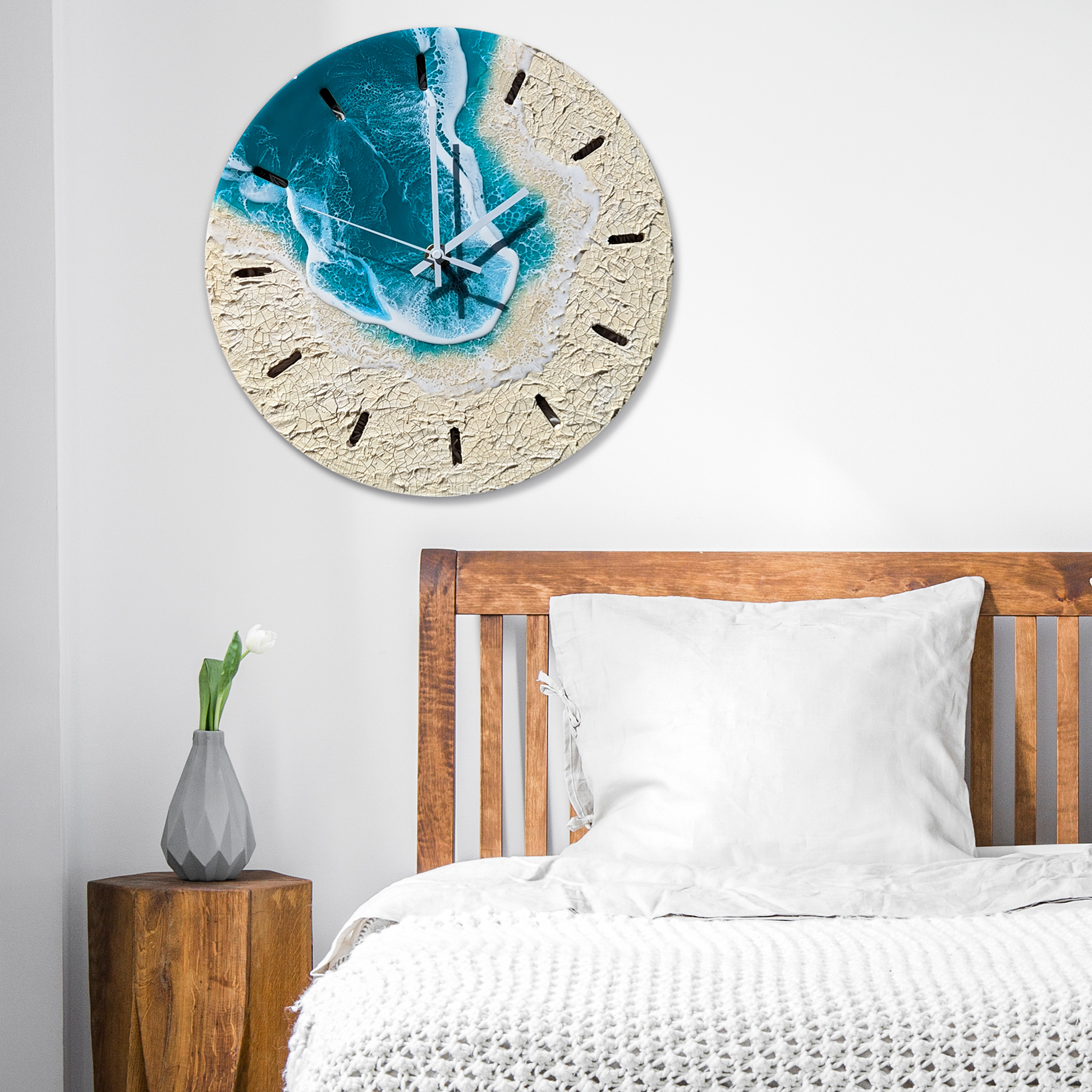 As you gaze at this clock, you can almost feel the cool, crisp water and the warmth of the sand beneath your feet. The gentle rolling waves crashing into the sandy beach, adds a soothing ambiance to any room.