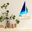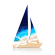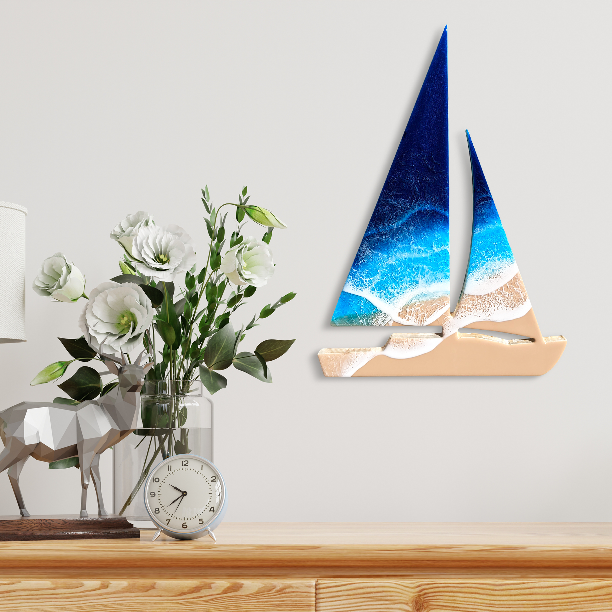 The sailboat wall art. This beautifully crafted work of art will transport you to the ocean with its lifelike water and beach scenes. The ocean color scheme, starting with dark blues at the top and transitioning to a sandy beach at the bottom, will inspire memories of your favorite beach vacations. The shimmering water effect adds a touch of magic, making this piece truly one-of-a-kind.