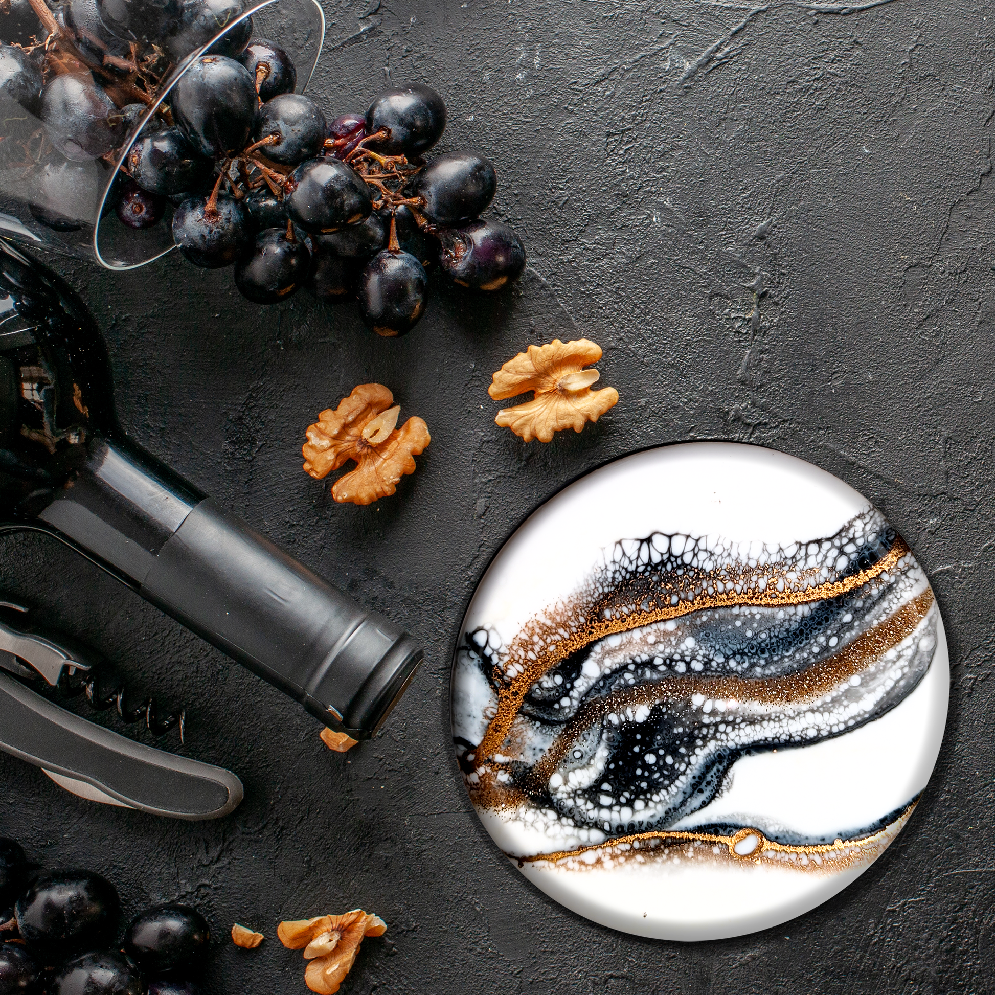 Add this beautiful and functional work of art to your collection and elevate your next gathering with the White & Gold Delight Themed Coaster Set. Also available as a set with the matching Themed Charcuterie Board.